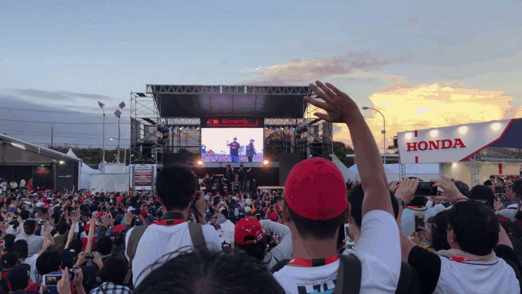 F1走行以外で一番盛り上がっている場所はグランプリスクエア周辺です。チームごとのグッズ店も揃っていて、HONDAブース、レッドブルブース、車やF1の展示、トークショーなどのイベントもここで開催されます。